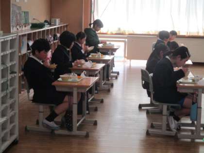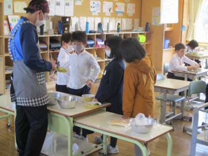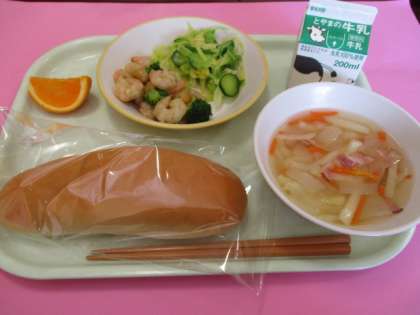 「こめこコッペパン、えびとひよこ豆のオリーブオイル炒め、そえ野菜、ポテトスープ、きよみオレンジ」でした。えびが苦手な子供もいるようで、量を調節する2年生でした。