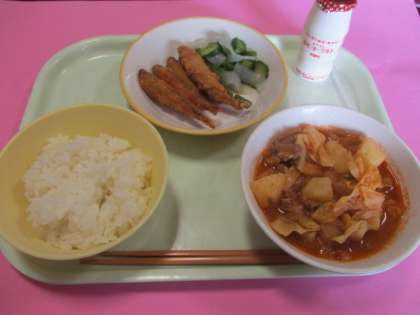 「ごはん、わかさぎのフリッター、ボルシチ、こんにゃくサラダ、飲むヨーグルト」でした。