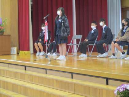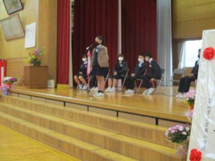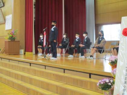 3月18日(金) 卒業生だけの離校式 公開日 2022/03/18 更新日 2022/03/18 6年生 前庭の「からかさ松」で行う予定だった「離校式」。残念ながら雨のため、体育館で卒業生と保護者のみで実施しました。一人一人が将来の夢や誓いを述べて、からかさ松に思いを届けました。その夢や希望に向かって大きく羽ばたくことを願います。ご卒業、誠におめでとうございました。ミニ動画→離校式1、離校式2