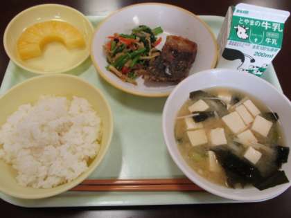 最後の給食は「ごはん、魚のかば焼き、はりはりあえ、味噌汁、カットパイン」でした。3学期の給食も、おいしく安全にいただきました。また、委員会児童は、1年間、放送の仕事を責任をもってやり遂げました。
