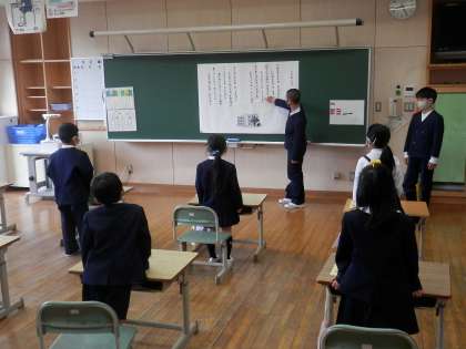 6年生さんが校歌を教えにきてくれました。歌詞がむずかしいけれど、はやく覚えられるようがんばっています。