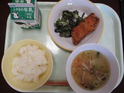 今日の献立は、ご飯、牛乳、あじの竜田揚げ、よごし、五目みそ汁です。みそ汁には、たまねぎ、にんじん、じゃがいも、しめじ、ねぎが入っていて、具だくさんのおいしいみそ汁です。
