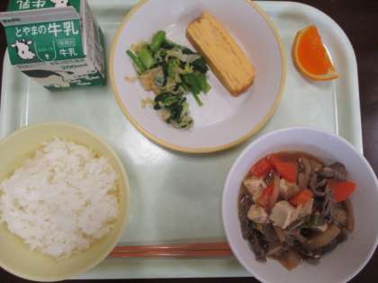 今日の献立は、ごはん、牛乳、厚焼き卵、おひたし、牛肉と大根のごますき煮、清見オレンジです。