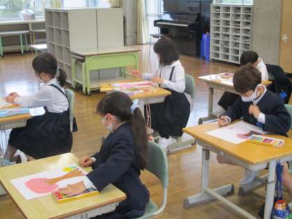 1年生は「好きなもの」、2年生は「春」の絵を描いています。