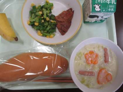 今日の給食は、米粉コッペパン、牛乳、照り焼きチキン、イタリアンサラダ、春キャベツのクリームシチュー、バナナです。
