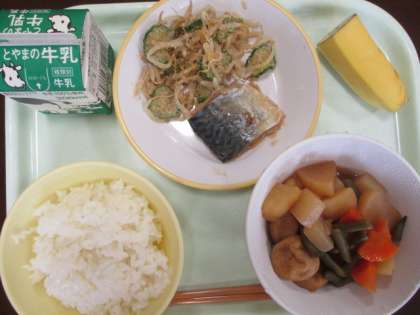 今日の献立は、ご飯、牛乳、さばの味噌煮、ごま酢和え、関東だき、バナナです。
