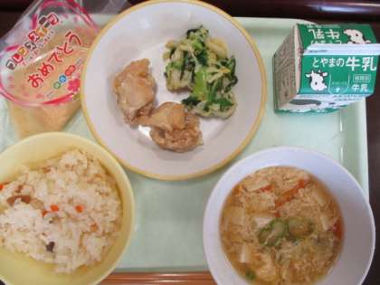 今日の献立は、1年生の入学をお祝いする「お祝い献立」です。ちらし寿司、からあげ、お祝いデザート、かきたま汁、チンゲンサイひたし、牛乳。どの料理も子供たちの大好きな献立です。