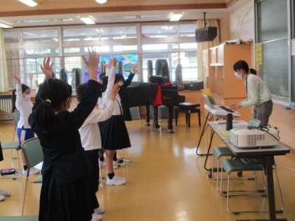 3年生は、音楽専科の先生と楽しく音楽の学習に取り組みました。音を体で表現したり、先生の声を真似したりして、音楽に親しんでいます。