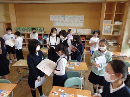今日は互いの好きな色や食べ物について尋ね合う活動を行いました。好みが同じ友達がいると喜びの声をあげたり、意外な好みを知って思わず日本語で「へぇー!」と言ってしまったりしながら、外国語に親しむことができました。