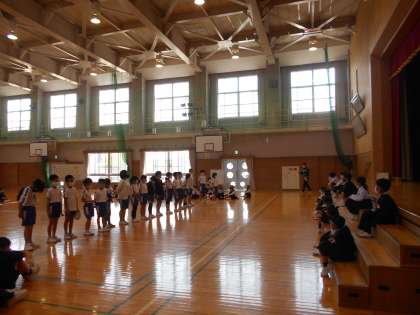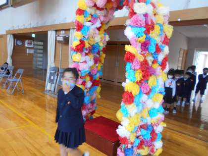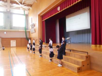 入学おめでとう集会が行われました。2年生から6年生の出し物を楽しみました。1年生の出し物「校歌」を大きな声で歌いました。