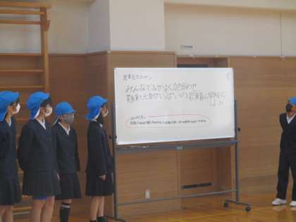スポーツフェスティバルに向けて結団式を行いました。今年度の児童会のスローガン「みんなでなかよく力を合わせ 笑顔と元気がいっぱいの岩瀬小学校にしよう」の紹介の後、6年生から下級生へ「がんばろう」のメッセージを伝えました