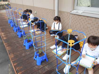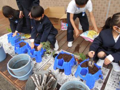 待ちに待った野菜の苗植え。苗を潰さないように、そっと土をかけてあげて...自分が植えた苗に名前をつけて、絵日記を書く様子。大きく育ちますように!