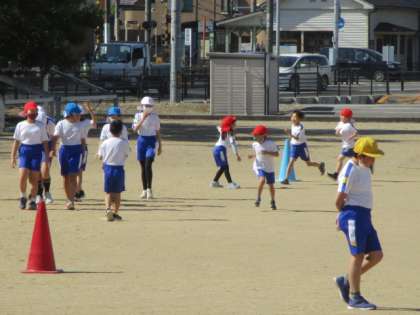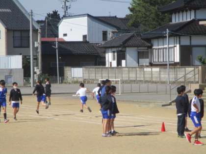 火曜の朝活動は「チャレンジタイム」です。グラウンドでは、50メートル走やランニングで体力つくりに取り組んでいます。