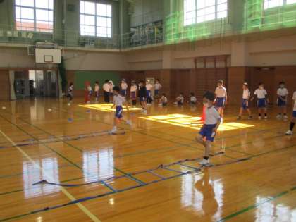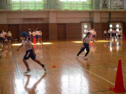 体育館では、3、4年生が障害物ランニングに取り組んでいました。