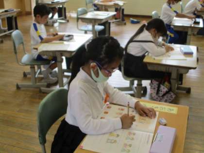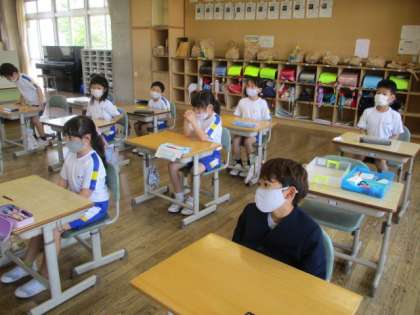 2年生は、プリントの直しをしていました。姿勢を正して先生の話を聞く準備をしています。
