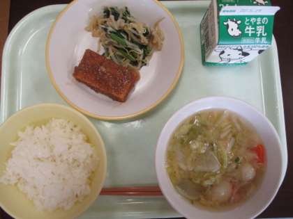 今日の献立は、ごはん、牛乳、揚げ出し豆腐のごまだれかけ、こんぶ和え、つみれ汁です。少し甘いごまだれがとても美味しいです。