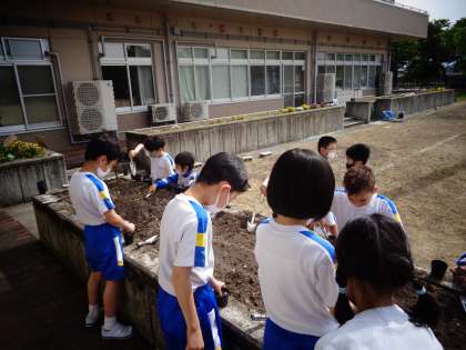 今日は理科の学習でヘチマの種を植えました。元気に育つように世話をしていきます。