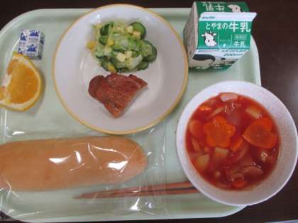 今日の献立は、米粉コッペパン、牛乳、照り焼きチキン、コールスローサラダ、ミネストローネ、ポケットチーズ、甘夏みかんです。