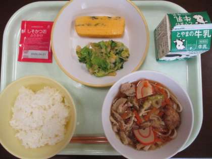 今日の献立は、ご飯、牛乳、かやくうどん、えごま入り卵焼き、おひたし、しそかつおふりかけです。具だくさんのうどんがとても美味しいです。