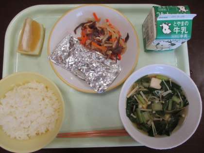 今日の献立は、ご飯、牛乳、さばの銀紙焼き、大根の中華きんぴら、すまし汁、河内晩柑です。きんぴらがシャキシャキしていて美味しかったです。