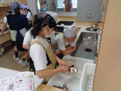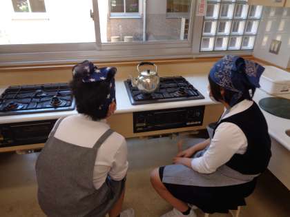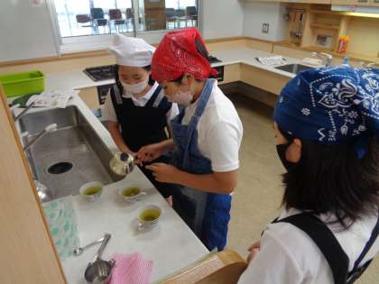 今日は家庭科室でお湯を沸かし、班ごとにお茶をいれました。「自分でいれたから、いつもよりおいしく感じる!」など、うれしそうな声が聞こえてきました。