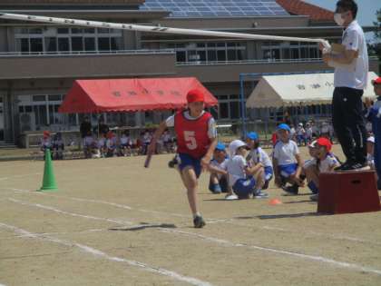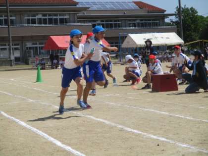 5、6年生による「エキシビションリレー」を行いました。バトンパスの仕方や真剣な走りを下級生に見せてくれました。