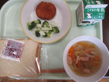 今日の献立は、食パン、牛乳、コロッケ、花野菜サラダ、ひよこ豆のスープ、いちごジャムです。