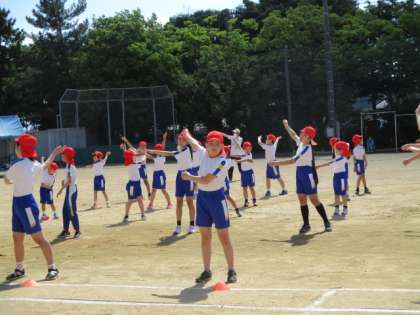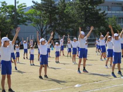 準備体操は、ラジオ体操です。大きく体を動かしています。