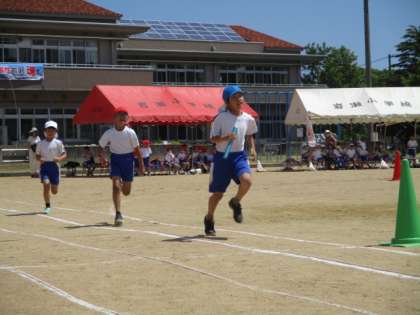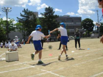 最後の競技は、下学年と上学年による全員リレーです。上学年はバトンパスが上手になりました。