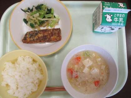 今日の献立は、ご飯、牛乳、魚の竜田揚げ、小松菜ひたし、ご汁です。