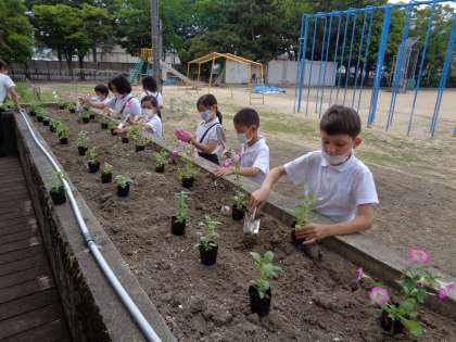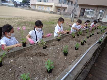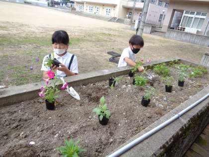 3年生の花壇に、花を植えました。彩りやバランスを考えて、丁寧に植えていましたよ。
