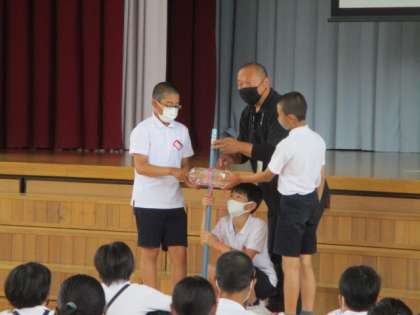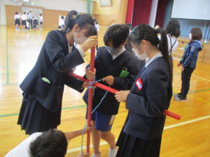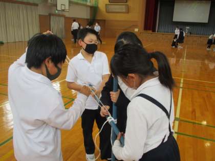 立山青少年自然の家から講師の先生に来ていただき、森小屋つくりのロープの縛り方を教えてもらいました。どの班も仲間と協力して活動できました。来週の宿泊学習が楽しみです。