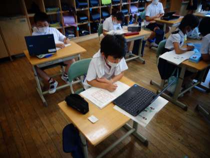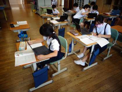 今日の国語の学習は、都道府県名を使って文を作りました。タブレットで、特産品や有名な場所を調べながら書きました。