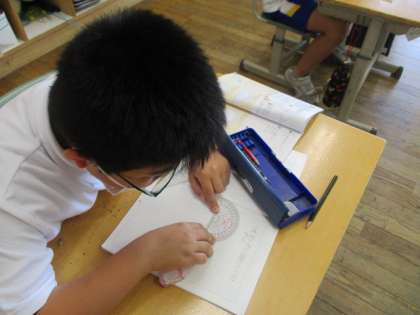 4年生は、算数で三角定規や分度器を使って三角形をかく学習です。