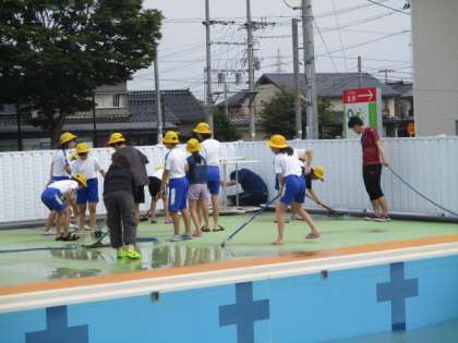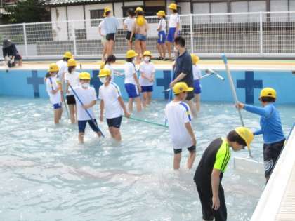 7月から始まる水泳学習に向けて、5、6年生がプール清掃をしてくれました。プール開きが楽しみです。