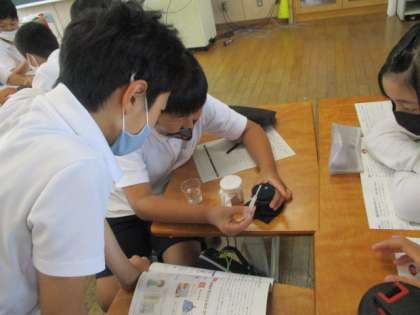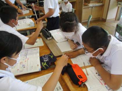 家庭科では、夏をすずしくさわやかに過ごすための住まい方や衣服の着方について学習しています。今日は、さわり心地や水の吸いやすさなど、綿とポリエステルの布の性質を比べました。