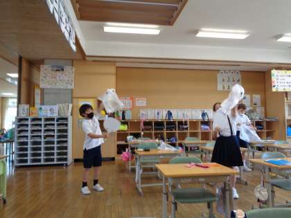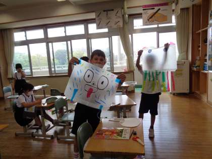 「イカにしようと思ったけど、作っていくうちに変わってきたよ」「ひらひらゆれる飾りを下につけたら、とてもきれいだったよ」と、とても楽しそうに作品作りに取り組みました。