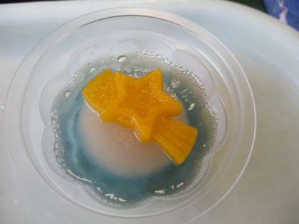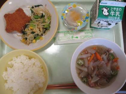 今日は、七夕給食です。星形のメンチカツや春雨とオクラ等が入った天の川スープ、デザートなど、季節を感じる献立です。今日の献立は、ごはん、牛乳、星形メンチカツ、コーン和え、天の川スープ、七夕デザートです。