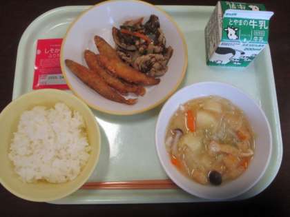 今日の献立は、ごはん、牛乳、わかさぎのフリッター、もずくのチャプチェ、具だくさん汁、しそかつおふりかけです。