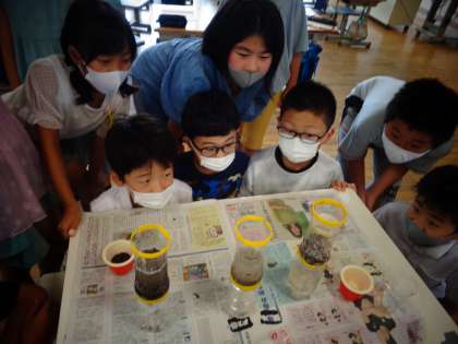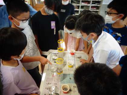 今日の理科は実験をしました。土と砂と砂利の水のしみこみやすさを比較して調べました。実験の様子を集中して見ていました。