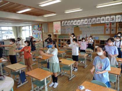 7月14日(木) 5年 ラジオ体操 公開日 2022/07/14 更新日 2022/07/14 5年生 今日の朝はラジオ体操第二の練習を行いました。何度か練習してきた成果が出たのか、あまりなじみのない動きもスムーズにこなしていました。