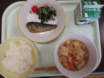 早いもので、1学期の最終週となりました。今日の献立は、ごはん、牛乳、いわしのマーマレード煮、磯和え、厚揚げの錦とじ、ミニトマトです。