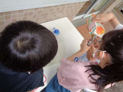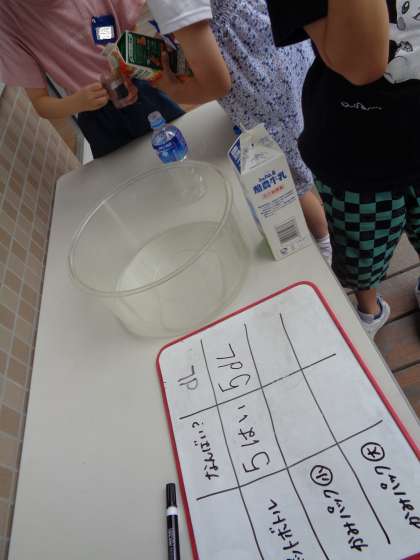 水のかさの学習では、実際にペットボトルと紙パックの水のかさを量って、1dLが何杯分かを調べました。どのグループも協力し、「何杯分か」という疑問から、「何dLか」にまで自ら発展させて書いていました。
