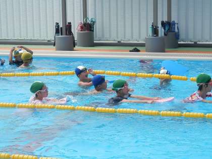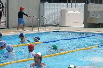 夏休みが始まりました。今日は学校のプールに30名あまりの子供たちが泳ぎの練習に来ていました。プールのきまりをしっかりと守っていて、すばらしいです。夏休みにたくさん練習して、目標を達成できるとよいですね。
