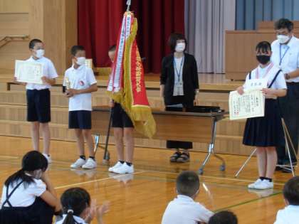 朝から始業式の会場準備を手伝ってくれる子供が数名いました。夏休みに行われた全国大会の報告を6年生二人が代表してお話してくれました。式後の片付けもみんなで協力して行いました。