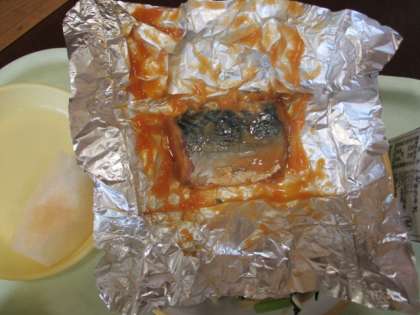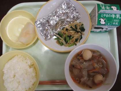 9月になりました。今日の献立は、ごはん、牛乳、さばの銀紙焼き、はりはり和え、冬瓜とつみれのスープ、梨です。梨が美味しい季節です。
