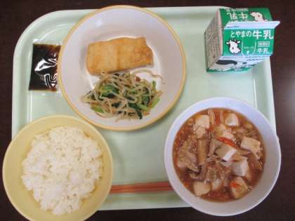 今日の献立は、ごはん、牛乳、ホキの米粉揚げ、香味和え、豆腐の野菜あんかけ、のり佃煮です。