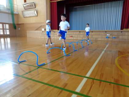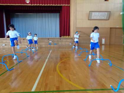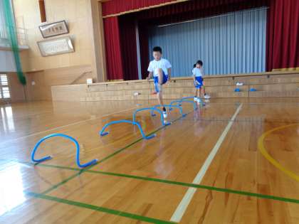 リズムよく跳んだり、腕の振りを利用して足を高く上げたりする練習をしています。