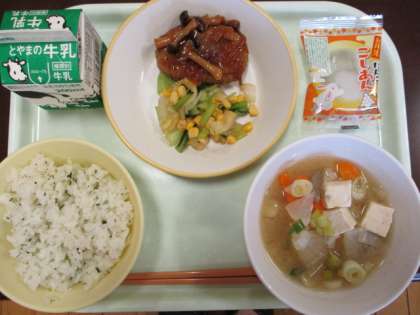 風が強く、とても暑い一日です。学校では、こまめに水分補給をし、熱中症予防に努めています。今日の献立は、菜めし、牛乳、ハンバーグのきのこソースかけ、コーン和え、さつま汁、月見大福です。さつま汁のレシピは、今月の給食だよりで紹介されています。