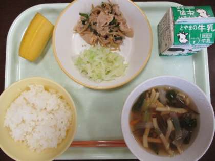 今日の献立は、ごはん、牛乳、豚肉のキムチ炒め、ゆでキャベツ、茎わかめスープ、バナナです。茎わかめスープは、たけのこや茎わかめの食感が美味しいスープです。